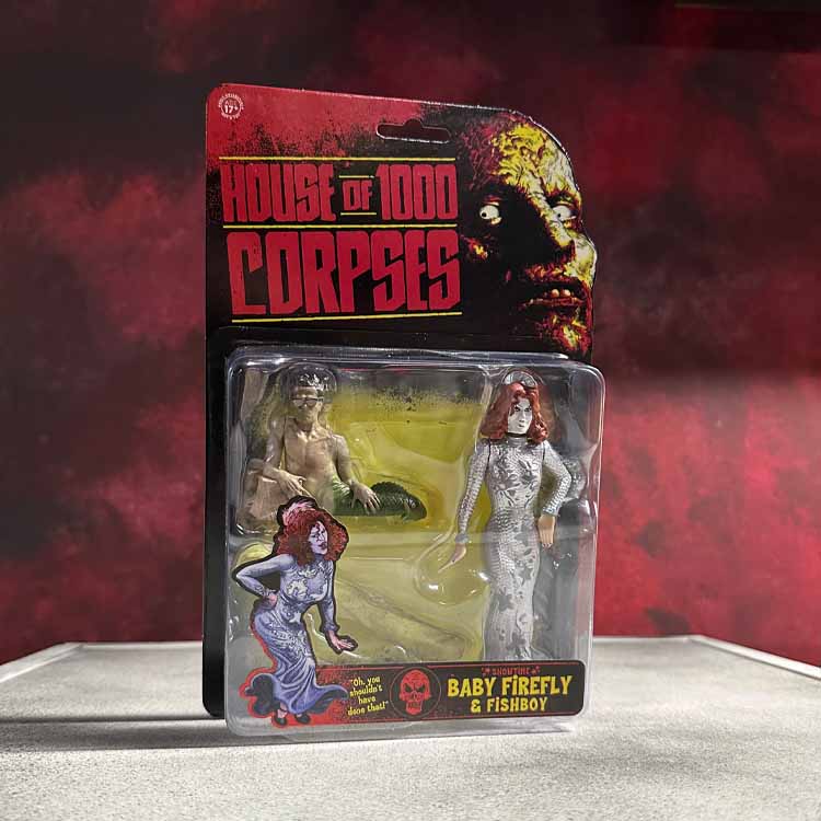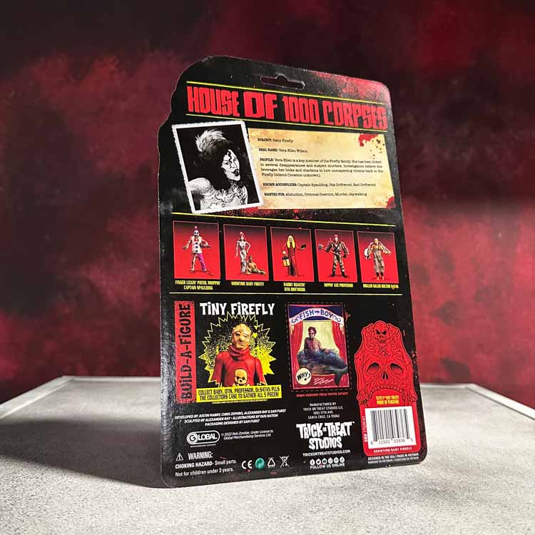 Terror 29 is thrilled to present the House of 1000 Corpses - Showtime Baby Firefly - Action Figure! Also featuring the gruesome FISHBOY! Oh no, Tiny Firefly is in pieces! Each figure includes a piece of Tiny in the package, so be sure to collect the whole family and the House of 1000 Corpses - Action Figure Collectors Case to complete this exclusive Tiny Build-a-Figure. Packaged in retro style action figure packaging just like your favorite figures from the toy aisle. Backing card features art by Dug Nation.