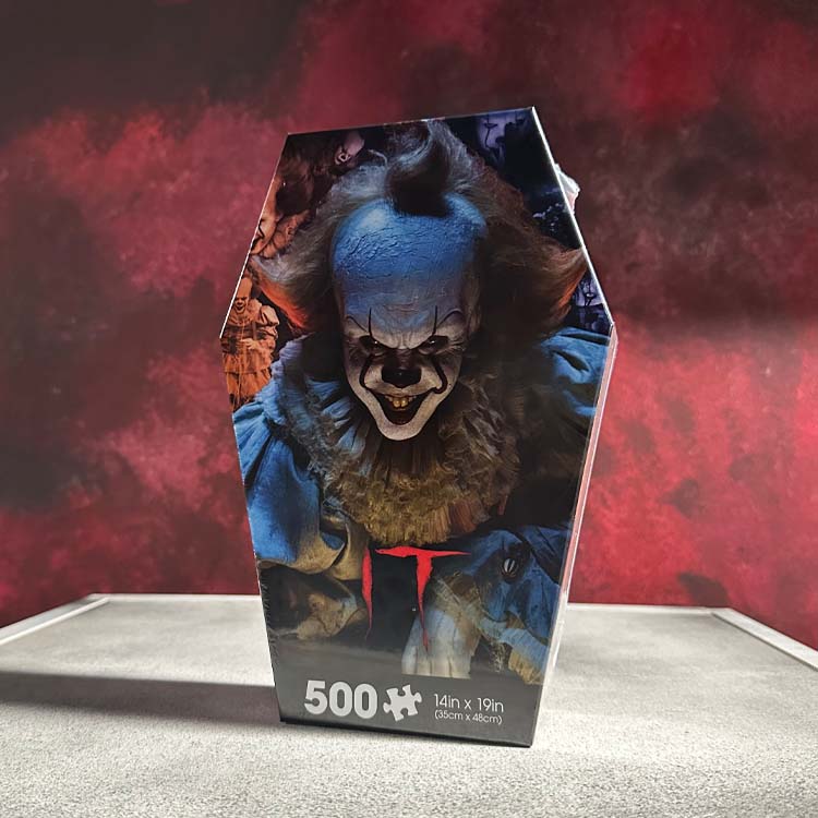 Bring the terror of IT to your tabletop with this officially licensed Pennywise 500-piece jigsaw puzzle inspired by the 2017 remake of Stephen King’s horror masterpiece. Featuring a chilling, high-definition image of Bill Skarsgård’s haunting portrayal of the Dancing Clown, this puzzle captures every unsettling detail—from Pennywise’s sinister grin to the ominous red balloon. Once completed, the 14" x 19" image makes a perfect display piece for any horror collection.